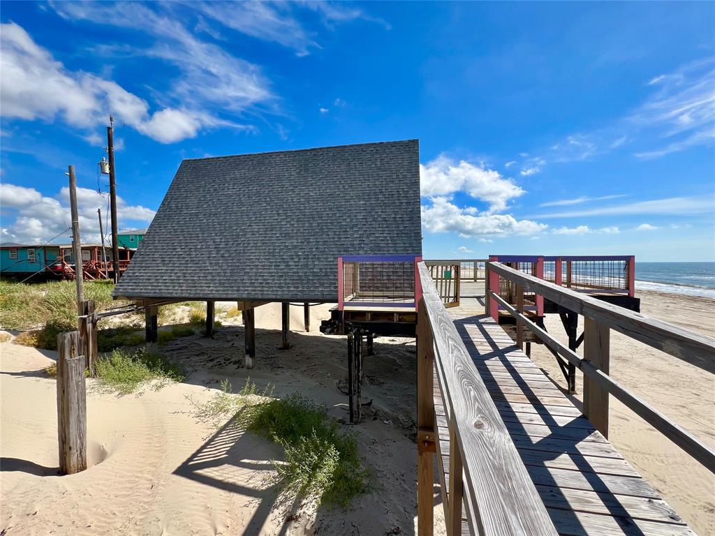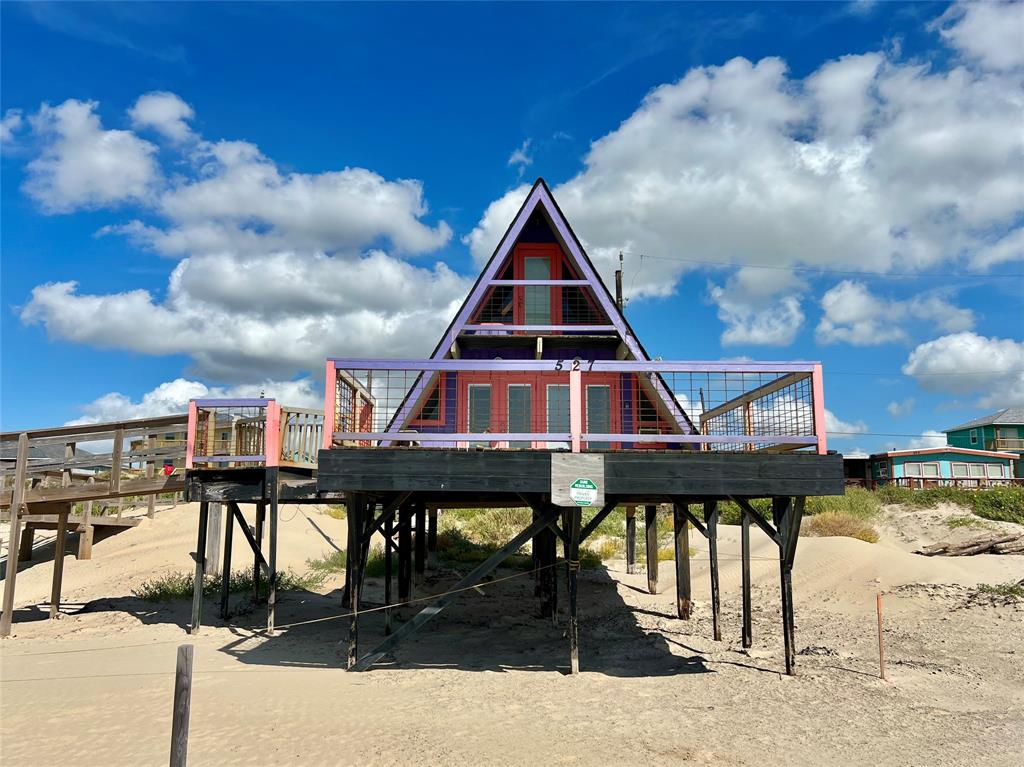 Located in Surfside Beach, this A-frame home features 2 bedrooms and 1.5 bathrooms. The property includes a beachfront deck with an outdoor shower and offers views of the Gulf. Inside, there is an open living area, breakfast bar, dining space, and windows facing the water. The bedrooms are positioned at the rear of the house for privacy, with a full bathroom on the main level. Upstairs, the loft contains a bedroom, lounge area, half bath, and a private deck overlooking the Gulf. The design supports an outdoor-oriented lifestyle by providing direct access to the beach
