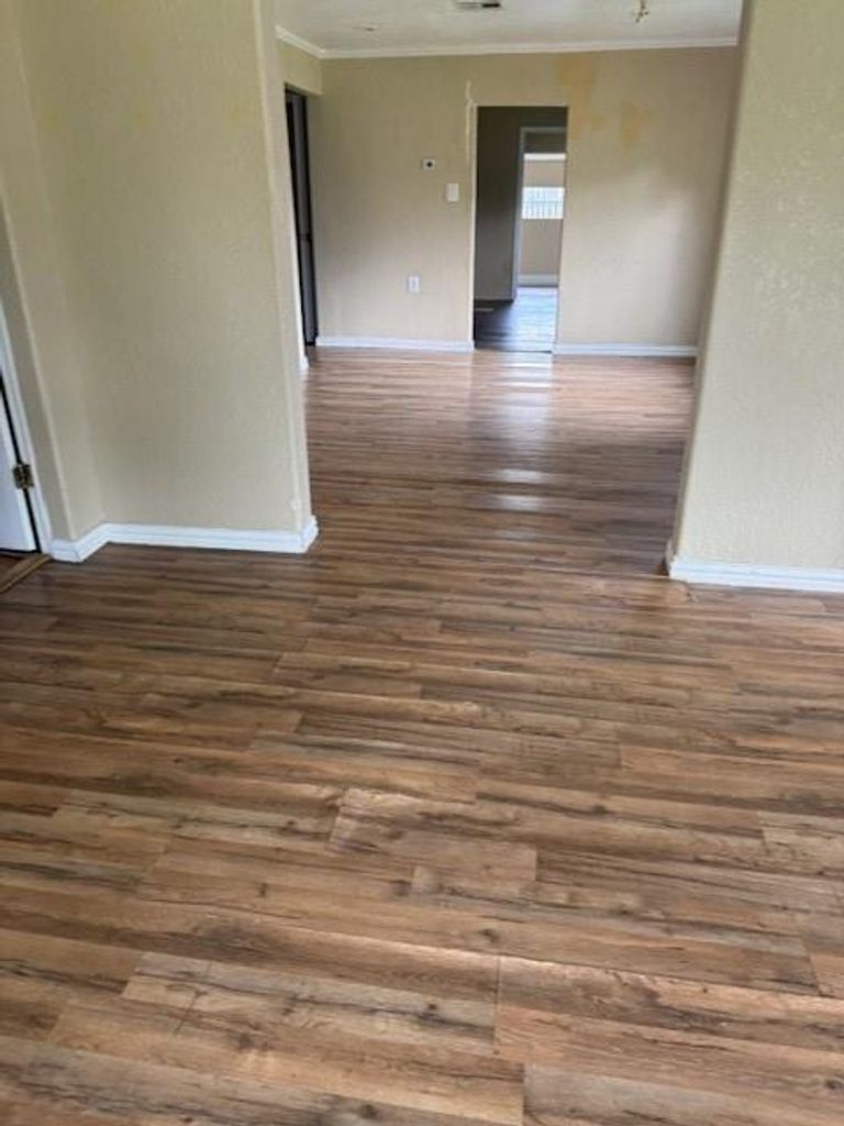 This 4-bedroom, 2-bath home is situated on a corner lot in downtown Sweeny and features laminate flooring throughout.