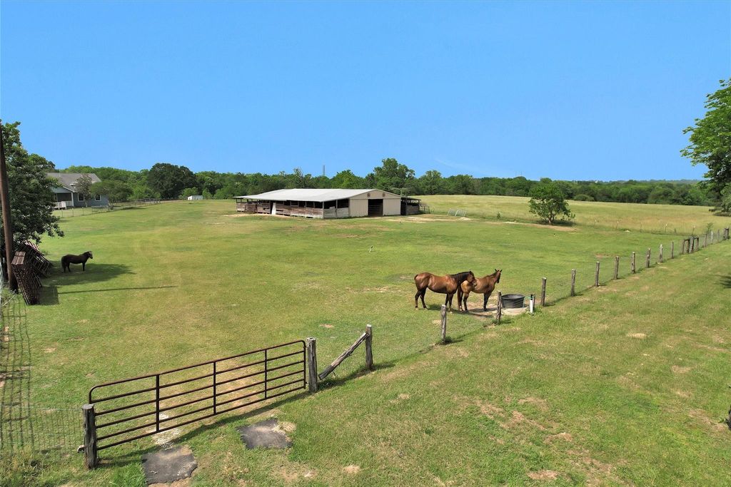 This 4 bedroom, 2 bath, 1 story home is perfectly situated on over 10.5 ag-exempt acres at the end of a dead-end road in Montgomery, TX. The property is fenced & cross-fenced w/ a 60x70, 18-stall barn (8 inside & 10 covered exterior) featuring a concrete alleyway, tool room, double tack/feed room & wash rack (all w/concrete) already in place. The front approx 4 acres are open & usable while the back acreage is wooded, adding a true country setting. Inside the home is an open layout w/ the kitchen flowing into a breakfast area & expansive formal dining. A wood burning fireplace, built-ins & abundant natural light highlight the living space. The primary suite includes a flex room ideal for an office or nursery & an ensuite w/ dbl sinks, soaking tub & separate shower. All 3 guest rooms are generously sized w/ excellent closet space. Recently replaced well pump & outdoor AC unit. The massive back patio is 3/4 covered w/ wide-open views of the breathtaking land. This is sure to top the list