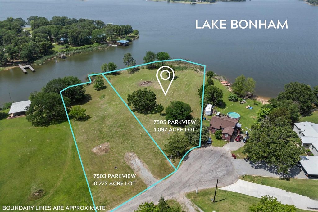 UNIQUE OPPORTUNITY TO BUILD YOUR DREAM LAKE HOUSE on the WATER - No build time requirement! Beautiful 1.097 ACRE waterfront cul de sac lot! Lake Bonham is perfect for fishing, water skiing, boating, tubing and jet skiing! Just 1 hour North of DFW. PERFECT OPPORTUNITY for you to LIVE THE LAKE LIFE! AND 0.772 Acre waterfront lot for sale next door too! - 7503 Parkview Drive, MLS 21250349. See survey in back docs and photos. See MLS documents for Parkview Addition building requirements. Minimum 1,000 Sq ft living area-excluding porches, patios, and garages. Minimum one-car garage. No manufactured or mobile homes. There are red flags on the lot for visualization estimation purposes only of boundary lines- Yellow and red flags down center between 2 lots- Must see survey in MLS docs for final boundary lines. Great Q and A for questions etc. available in MLS about these lots and Lake Bonham. It's time to WAKE AT THE LAKE!