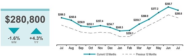 Home Price The median home price decreased to $280,800 in July, down 1.6% from June. The median home price has increased by approximately $11,500 in the past year alone.