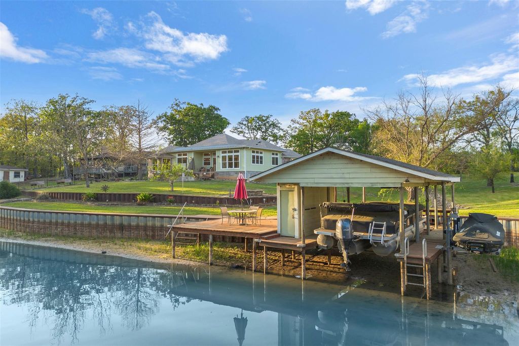 Welcome to this charming 3 bedroom, 2 bath waterfront home. This home offers the spacious comfort of an open concept living & dining. Kitchen with granite counters, stainless steel appliances, lots of cabinets for storage and a built-in dining area. The primary bedroom features a private retreat, vaulted ceiling, garden tub, dual vanities and walk in shower. A bright sunroom adds extra space to relax, read, or simply enjoy the view, and a dedicated office makes working from home feel a little less like work. Step outside to enjoy your own boat dock, swim platform and stone fire pit perfect for leisurely days or entertaining guests. Beyond the home, the Enchanted Oaks community adds even more to love with a swimming pool, playground and dog park. Located just minutes from shopping and dining.
