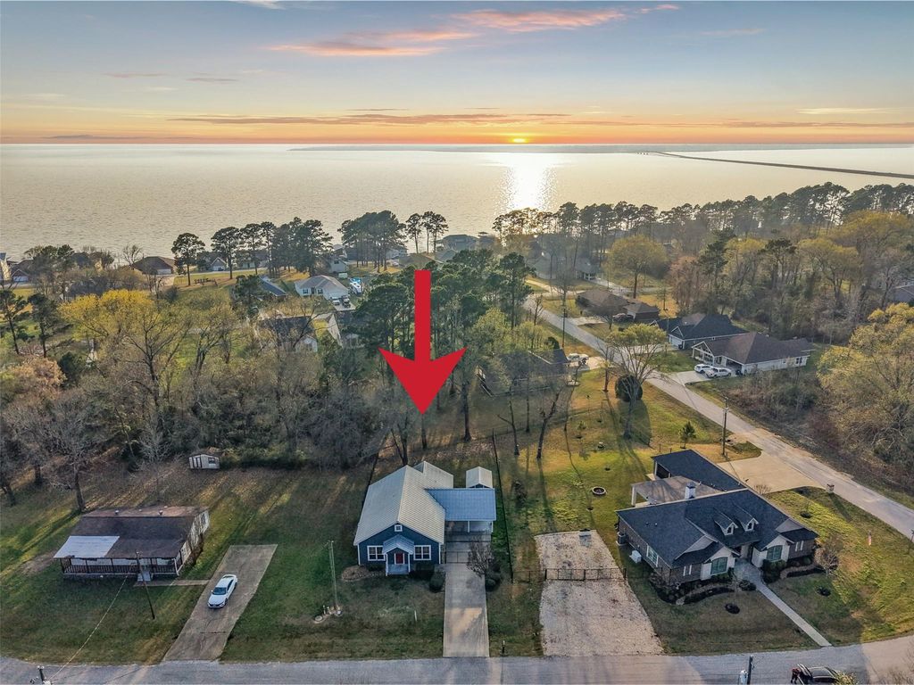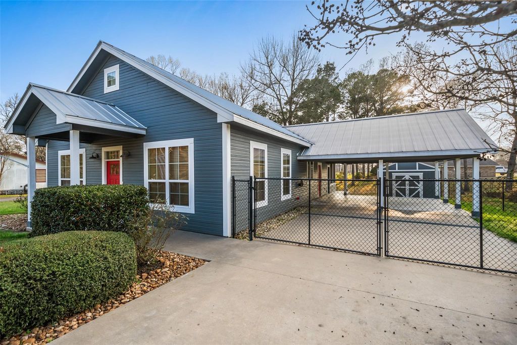 Super cute home situated on oversized lot in Bridgeview at Lake Livingston with paved, gated driveway leading to attached double carport. Quaint front porch welcomes you into this charming 2-bed, 2-bath farmhouse-style home featuring an open-concept layout and distinctive vaulted ceiling with exposed white wood beams that enhance the bright, airy living space. Stunning kitchen offers colorful pallet wood backsplash, abundant cabinetry, SS appliances, drop-in electric cooktop, butcher block countertops and spacious island with generous storage and ample seating. Primary suite features ensuite bath with dual sinks and walk-in shower, while the secondary bedroom and bath include an oversized vanity with storage. Enjoy outdoor living on the 204 sq ft screened-in porch, fenced shaded backyard, and storage building. Located in water-access community with short walk to the boat ramp and park, this home offers easy access to lake days, outdoor fun, and breathtaking Lake Livingston sunsets.